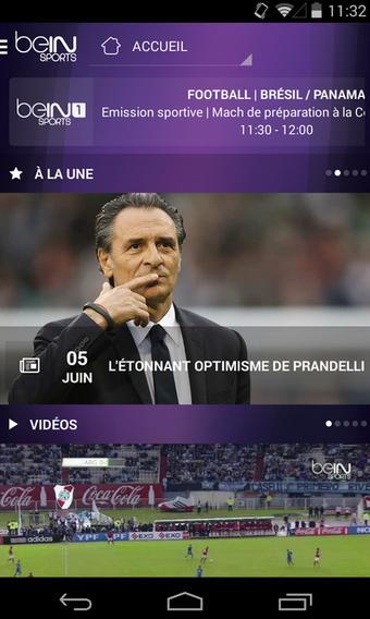 Avec l’application BeIN SPORTS, suivez toute l’actualité sportive en images et vidéos. Vous y trouverez les résultats, classements, matchs et compétitions à venir pour de nombreuses disciplines sportives (Football, Rugby, Tennis, basket...)